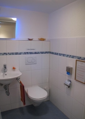 Die Toilette ist direkt aus dem Therapiebereich zugänglich. In einem kleinen Nebenraum besteht die Möglichkeit, Warmwasser für Getränke oder Therapie zuzubereiten. Dort befindet sich auch eine Audioanlage, die CDs und USB-Sticks abspielen kann. Die Lautsprecher sind im Therapiebereich unsichtbar angeordnet.